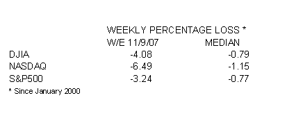 While negative weeks are not unusual –there have been 155 of these, or 39 percent of all, since 2000- this week’s decline is far greater than the median. Indeed, the minus 6.49 percent NASDAQ loss this week is the deepest since April of 2000. The DJIA and the S&P500, as shown in the table below, marked similar drops.