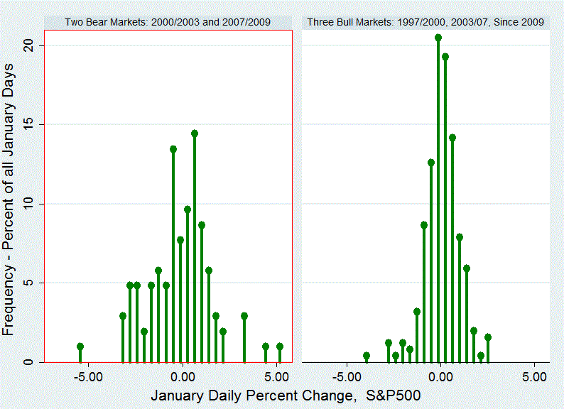 Today’s diagram shows the divergence of daily price changes for the entire month of January. It summarizing these rates for expansions and declines. It reveals that bull markets experience a much narrower band of daily changes than bear markets.