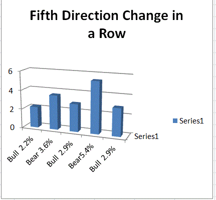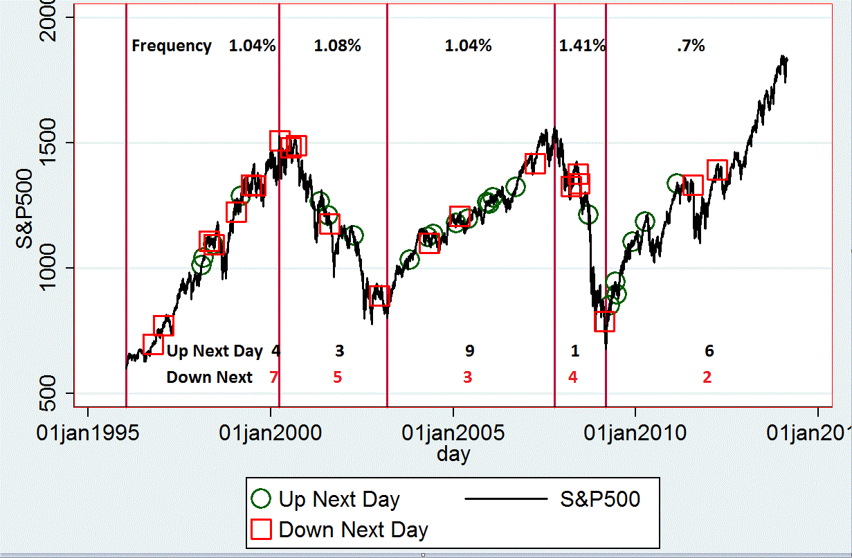 Prices on the following day decline more often than they rise, during declines, while the opposite happens when prices move up. Next day increases outweigh declines three to one in the 2003/2007 expansion and in this recovery that dates back to March 2009.