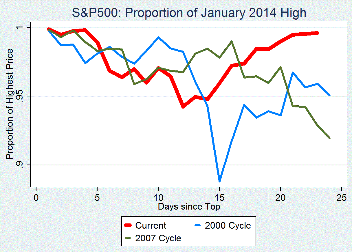 Comparing the profile of the S&P500, now some 23 days after the January peak, with earlier bull market highs –in today’s diagram- reveals no similarity. In fact, it allows for significant optimism for the proposition that prices will continue their ascent and soon the S&P500 and the DJIA will pass their January highs.