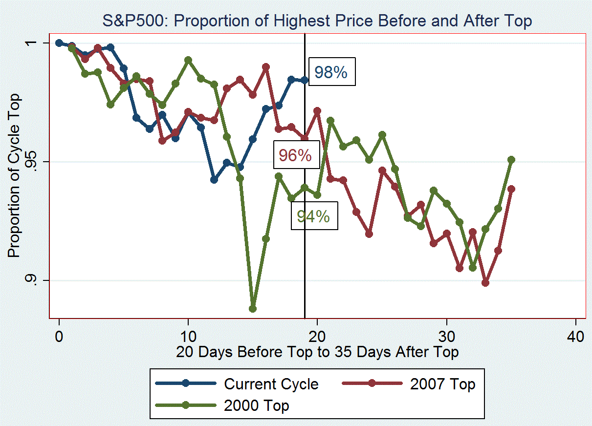 Today’s diagram plots the S&P500’s closing prices twenty days before through 35 days after market tops. It reveals prices moving higher soon after these earlier bull markets ended. Moreover, even after these prices turned down- 20 to 21 days –after their highs, the market moved sharply higher.