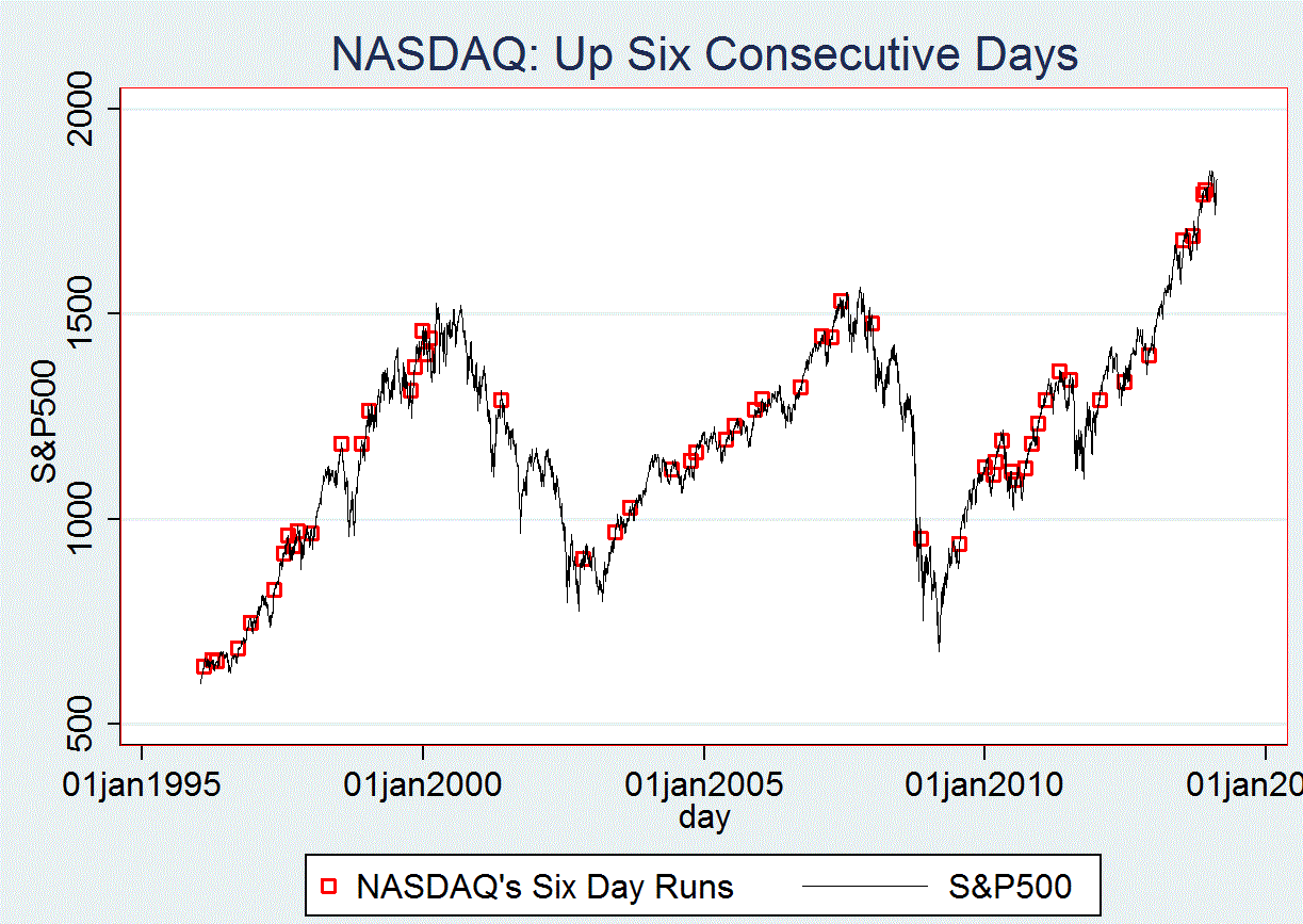 The diagram reveals that such series occurred once in twenty days during the 2007/2009 decline; in stark contrast, that frequency was just once every 45 days in the 1996/2000 bull market. That ratio is once per 34 days in the current, since 2009, expansion.