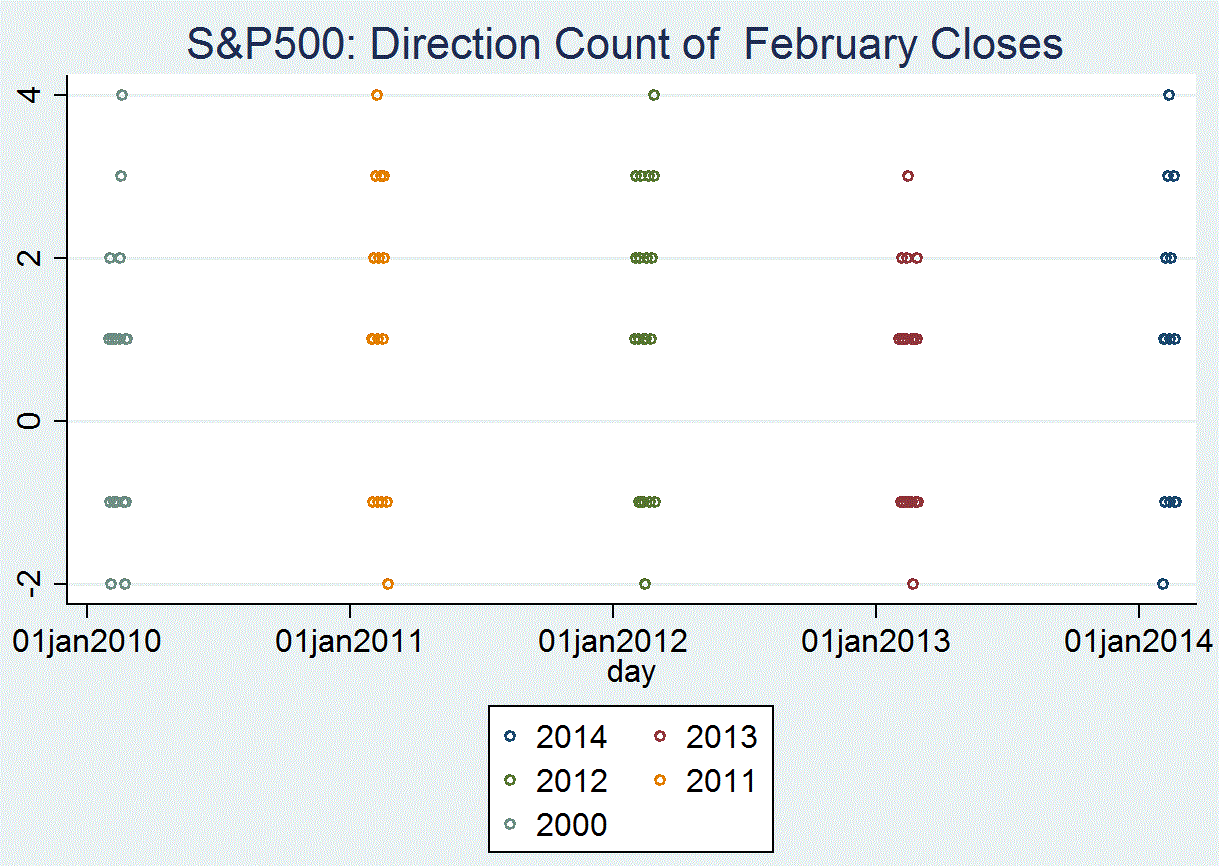 Saturday, February 22nd, 2014Prices changed direction again, declining after rising the day before. Given this bull market’s age and its clustering just below its January record high, we consider the pattern of daily price changes. The diagram shows the ‘frequency count’ in February for each of the past five years.