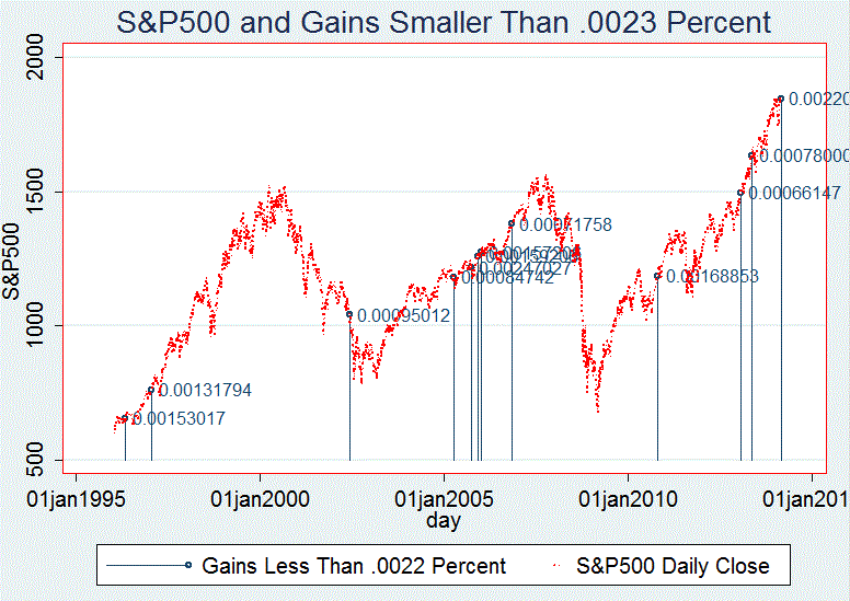 Note that this year has the smallest distance, or the shortest line, at both plus one and minus one. This indicates that changes in the opposite direction –that is daily ups and downs- for 2014 are far less frequent than in any of the last four years. Accordingly, conclusions that daily price fluctuations indicate an imminent change in direction are inconsistent with the record.