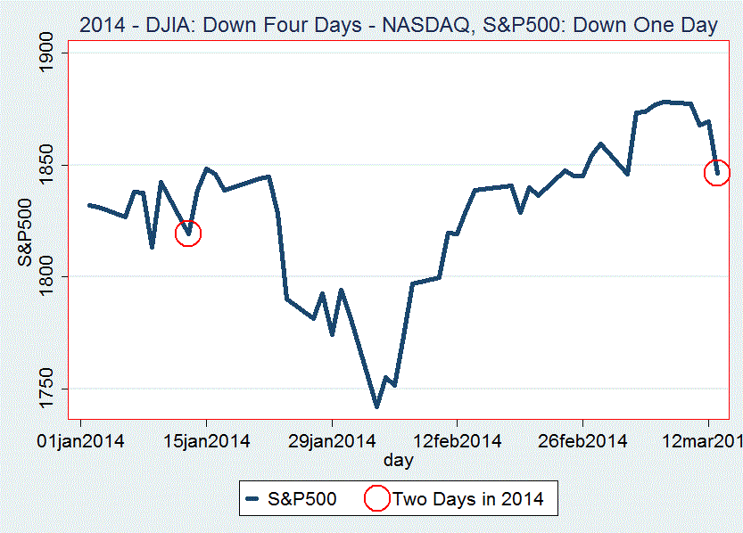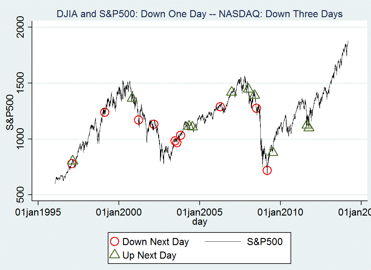 Additionally, five of the last six trading days, have frequencies of less than one percent. The usual combinations of daily ups and downs for these three market indexes have frequencies as high as 15 to 20 percent.