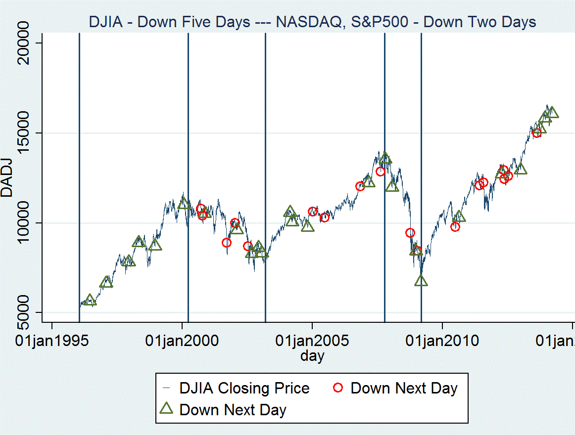 It was the fifth straight negative day for the DJIA. Only 41 other closes since 1996 have such a losing string. The diagram locates these days; it shows these quite evenly distributed over bull and bear markets. Though the frequency percentage is twice as great in declining markets, the numbers are minuscule. They run from .57 percent in the 1996/2000 expansion to 1.69 percent during the 2007/2009 decline.