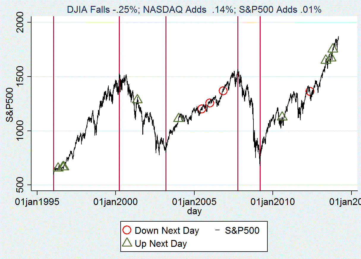 The analysis, and the diagram, considers the history of the distinctly different changes of the DJIA, down .22 percent, the NASDAQ, up .14 percent, and the S&P500, up .01 percent