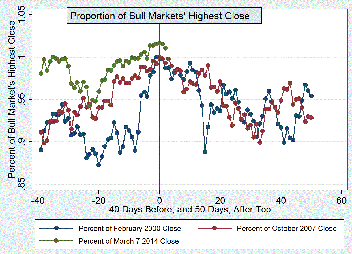 Today’s diagram updates recent profiles comparing this bull market with the previous two, in 2000 and 2007. It uses the recent S&P500, March 7 high as the zero baseline of the current expansion.