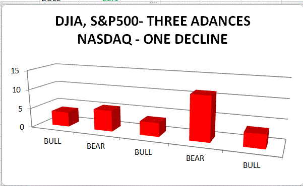 The negative indicator, shown on the second chart, considers today’s pattern of three gains for the DJIA and the S&P500 combined with a decline of the NASDAQ. It reveals this combination is far more frequent in bear markets; in fact, the ratio of bear to bull market occurrence is also around two to one.