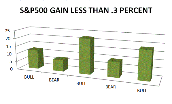 Yet we find today’s action yielding two opposite signs. The good news is the relatively modest gain of the S&P500. At just .3 percent, the record shows that advances this small occur more often in bull markets. The first diagram shows these small gains in rising and falling markets. They are near twice as common when prices are rising.