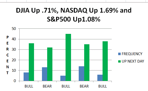 Though the NASDAQ and the S&P500 extended their winning streak to four days, the DJIA lost ground, albeit just barely, closing down at minus .10 percent. Today’s diagram, plotting such closes over the past 5 price cycles, shows this pattern to be rare and also to be associated with rising prices.
