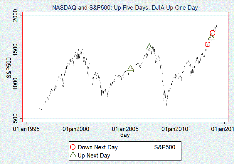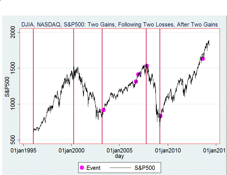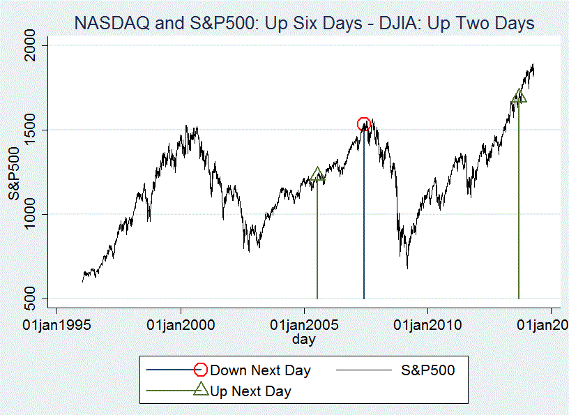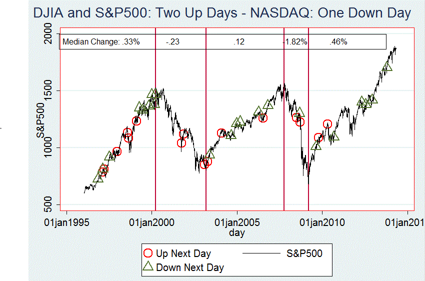 The DJIA and the S&P500 closed higher for the second day in a row while the NASDAQ closed up after declining the previous day, scoring a rare pattern seen on just 38 of the last 4,605 days. The diagram locates these events over the last five price cycles since 1996.