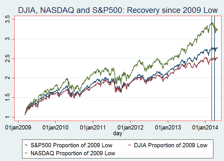 Yet consider two adverse facts that should tamper any celebrations. First, the DJIA has, and continues, to lag behind the NASDAQ and S&P500. As our diagram clearly shows, these two meters have outperformed the DJIA during this entire recovery. Today’s NASDAQ close is 324 percent of the March 2009 low while the S&P500 stands at 278 percent.