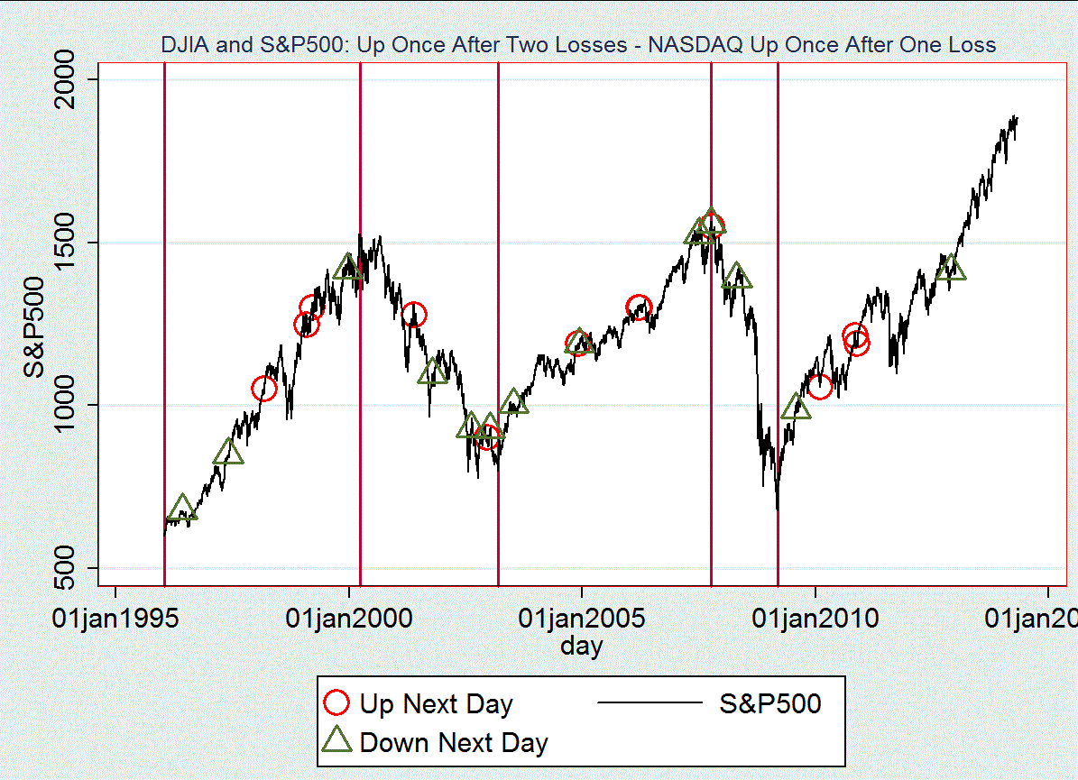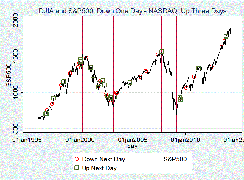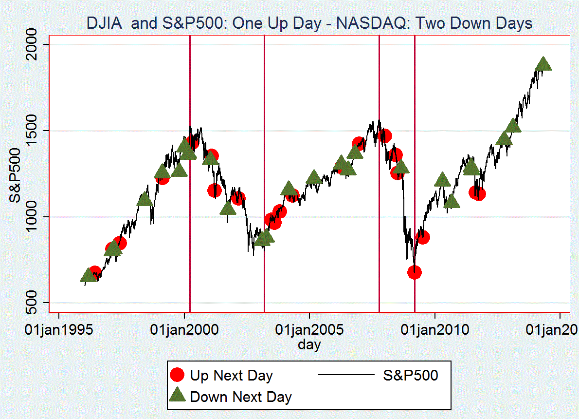 The DJIA and the S&P500 closed higher for the second day in a row while the NASDAQ closed up after declining the previous day, scoring a rare pattern seen on just 38 of the last 4,605 days. The diagram locates these events over the last five price cycles since 1996.