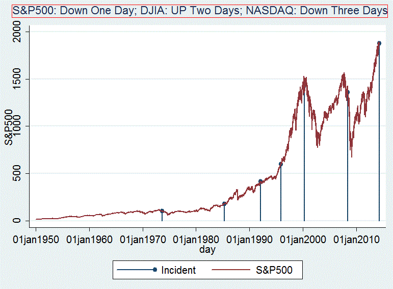 With the NASDAQ scoring its third successive gain and the DJIA and the S&P500 losing ground for the first time after three straight up-days, we see a somewhat common pattern. The last occurrences were twice last November, one in September and one in June 2013.